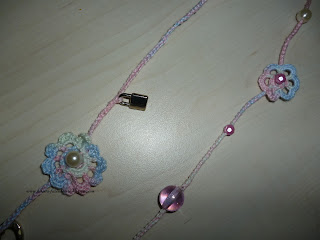 Acabei de fazer mais dois colares, com flores de crochê e reaproveitamento de miçangas de bijuterias que não usava mais.
